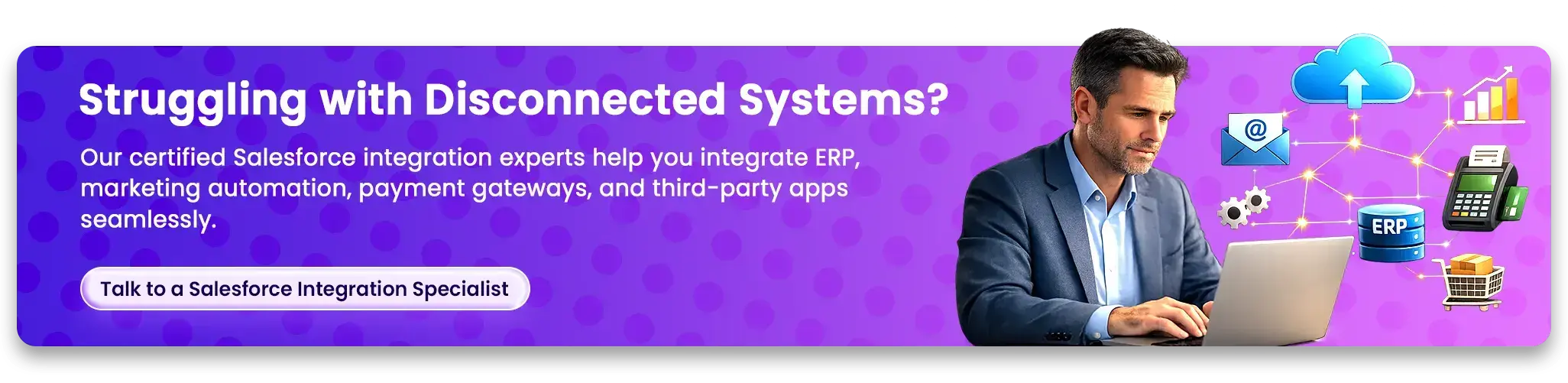 Salesforce Integration connects Salesforce with other systems, applications, or data sources. It keeps information up to date, consistent, and easy to access for all teams. Rather than working in isolation, everyone in the organization can rely on a single source of truth, whether it’s customer data, financial records, or marketing interactions.