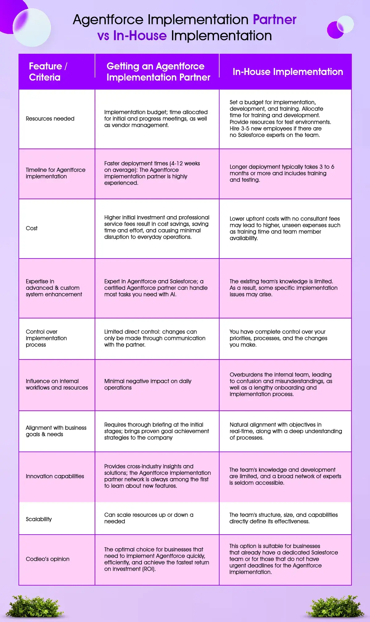 You can either set it up yourself or collaborate with an experienced implementation partner if you wish to use Agentforce. Every choice has advantages and disadvantages. While doing it yourself gives you total control and may result in upfront cost savings, partnering can offer professional assistance and expedite the process. Select the option that best aligns with your team's skills, budget, and schedule.