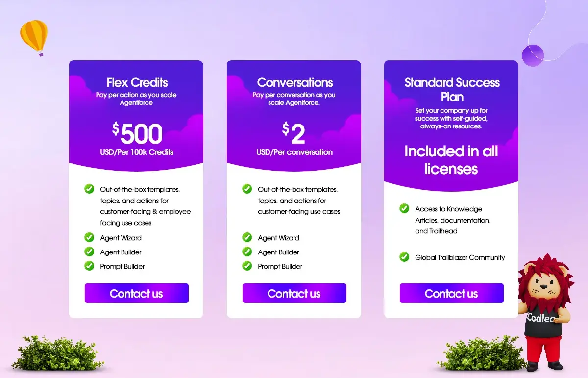 You can pay for Agentforce using Flex credits for each action or by paying per conversation. Below is a detailed breakdown of the pricing.