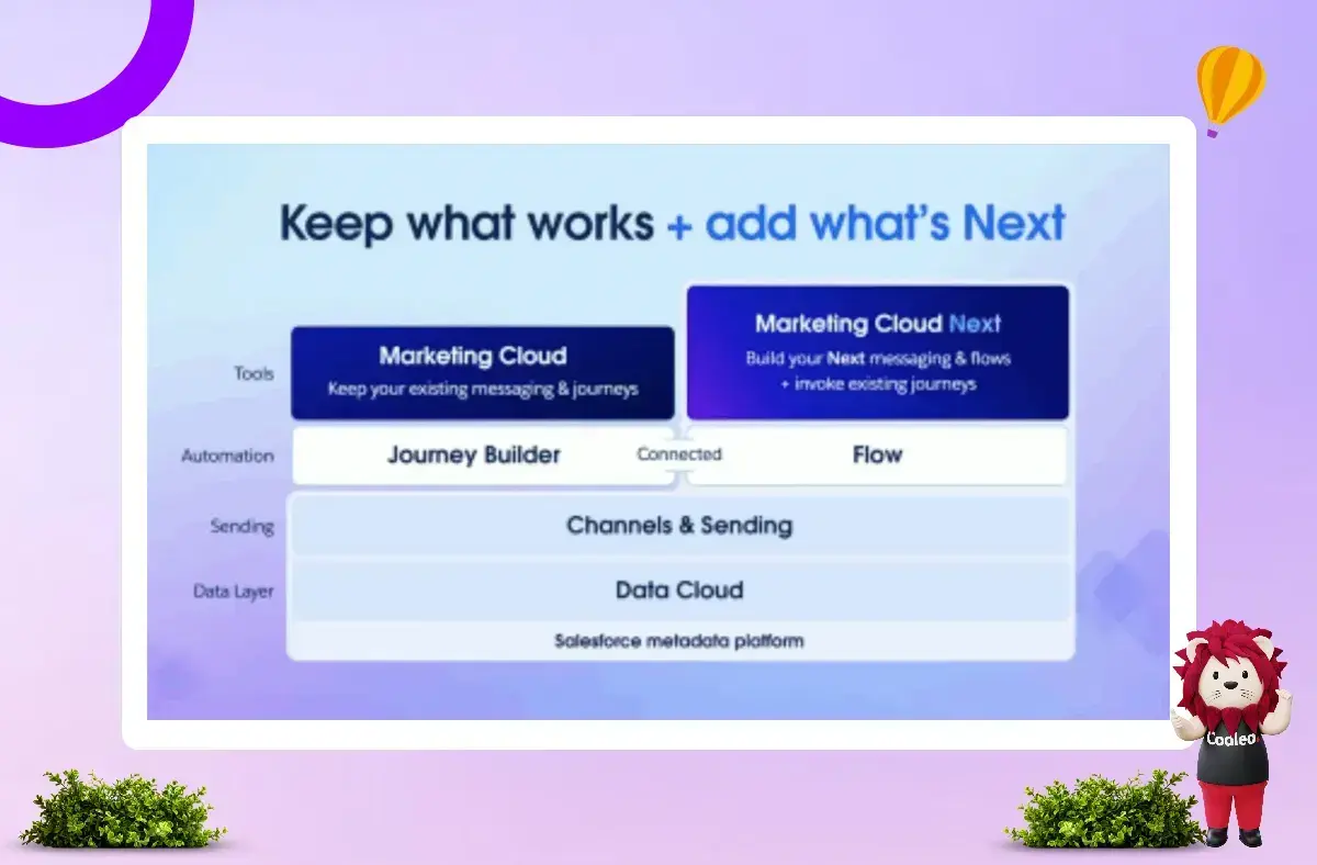 Salesforce will soon offer Marketing Cloud Next alongside Marketing Cloud Engagement (formerly ExactTarget). It means you can start using the new technology before the complete switch. Salesforce wants to clarify that this process is not a migration; it is a convergence. Your previous investments in segments, automation, and other features will still be available in Marketing Cloud Next.